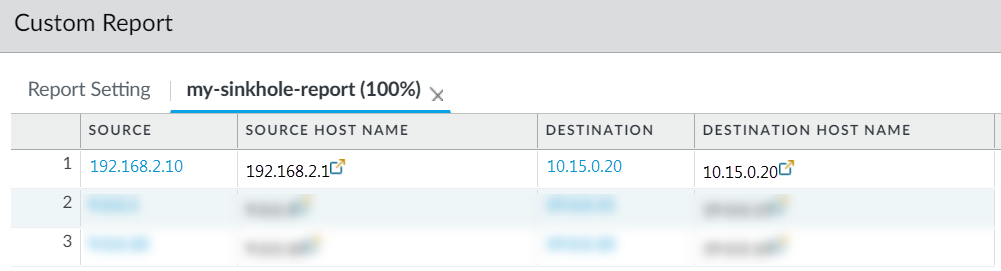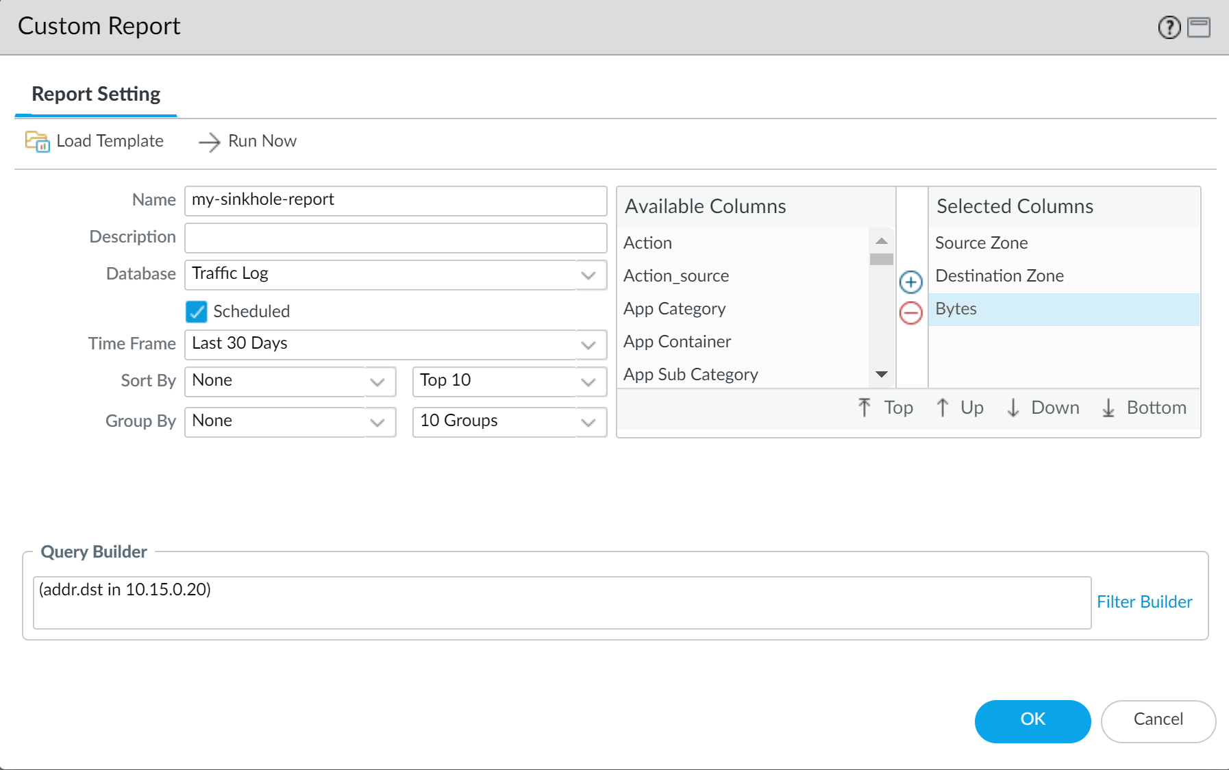 - Selected Columns—Select Source address or Source User (if you have User-ID configured), which will identify the infected client host in the report, and Destination address, which will be the sinkhole address.