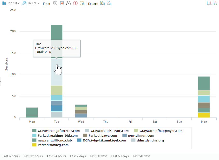 - Select MonitorApp Scope and select Threat Monitor.Click the Show spyware button along the top of the display page.Select a time range.The following screenshot shows three instances of Suspicious DNS queries, which were generated when the test client host performed an NSLOOKUP on a known malicious domain. Click the graph to see more details about the event.