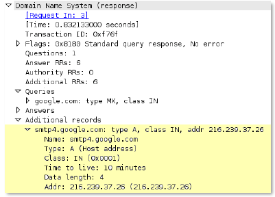 Additional records section if found in a DNS request (normal DNS requests should not have an additional records section).