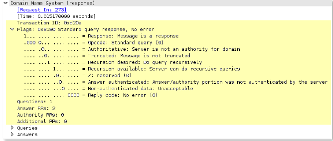Full DNS response header, which includes the transaction ID, query flags, the number of questions, and the Resource Record (RR) values.