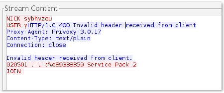 You can see by following the TCP stream in Wireshark that there is data in between the IRC commands. It appears this message was Proxied.