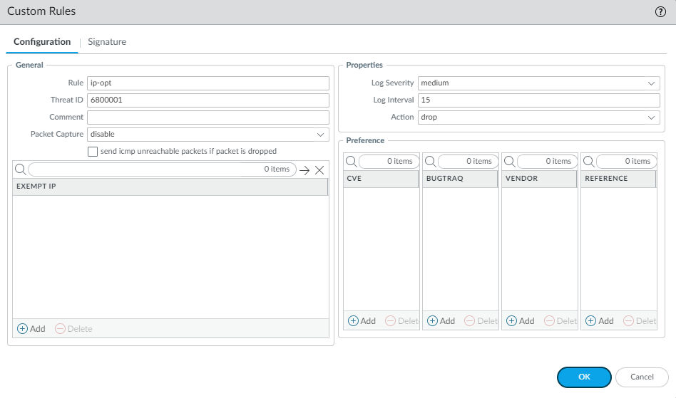 Create a Zone Protection profile and configure your L3 & L4 header inspection settings.- Select NetworkNetwork ProfilesZone Protection and either select an existing profile or Add a new profile.If you are creating a new zone protection profile, enter a Name for the profile and an optional Description.Select L3 & L4 Header Inspection to define your custom vulnerability signatures.Add new custom rules by defining the configuration and signature details for each entry, which are performed in their respective tabs: Configuration and Signature.Under Configuration, fill out the following required fields in the General, Properties, and Reference section.