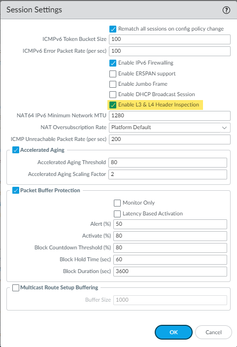- Log in to the PAN-OS web interface.Select DeviceSetupSession and enable L3 & L4 Header Inspection globally on the firewall.