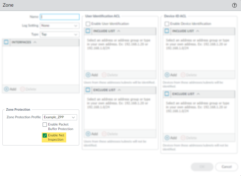 Apply the Zone Protection profile to a security zone that is assigned to interfaces you want to protect.- Select NetworkZones and select the zone where you want to assign the Zone Protection profile.Add the Interfaces belonging to the zone.For Zone Protection Profile, select the profile you just created.Select Enable Net Inspection to enable the L3 & L4 header inspection configuration settings.