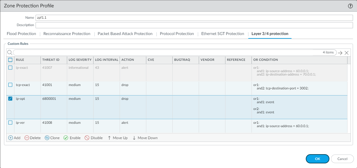 Repeat for each matching condition that you want to add.Click OK and review your signatures. Click OK again to return to the zone protection profile.From the L3 & L4 Header Inspection tab, you can reorder, disable, and clone the custom rule entries as necessary. Click OK to exit the zone protection profile.