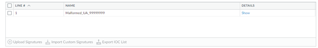Click OK.Your signatures will populate at least one of the following tabs: Succeeded, Succeeded with Warnings, Failed, Duplicates, or Existing Coverage.(Optional) Export rules to an indicator of compromise (IOC) list.Panorama converts a rule that does not contain the keywords content or PCRE into an IOC List. Export IOC List to group these rules into a text file that you can use as an external dynamic list for your Security policy rules.- Select Export IOC List.A dialog displays any rules that converted as IOC List.