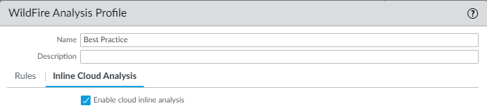 - Select your WildFire analysis profile and then go to Inline Cloud Analysis and Enable cloud inline analysis.