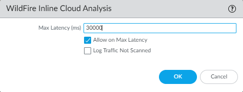 - Max Latency (ms)—Specify the maximum acceptable processing time, in seconds, for Advanced WildFire Inline Cloud Analysis to return a result.