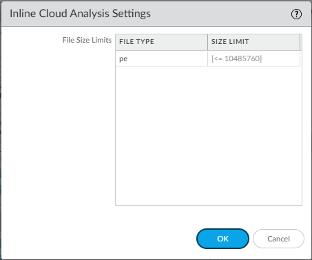 - Select DeviceSetupWildFireInline Cloud Analysis Settings and review the file size limits.
