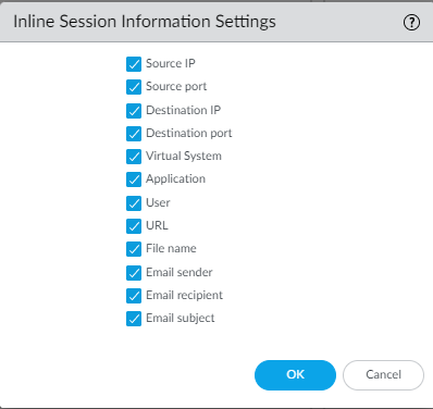 - Select DeviceSetupWildFireInline Session Information Settings and select or clear the options as necessary.