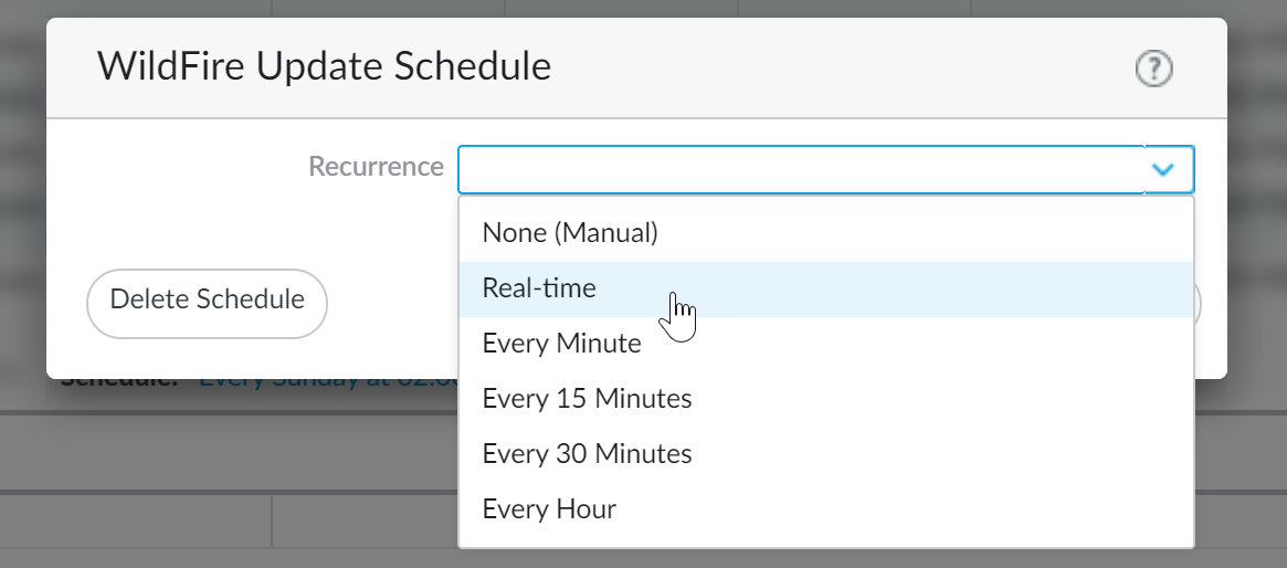 Set the schedule for the firewall to retrieve WildFire signatures in real-time.Even when the firewall is configured to use real-time signatures, supplemental signature packages are still installed on a regular basis. This provides an up-to-date signature source when you experience connectivity issues, as well as a speed benefit, where signatures are available locally.