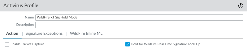Select OK when finished.Update or create a new Antivirus Security profile to enable hold mode for WildFire real-time signature lookups.