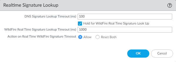 - Select Device Setup ContentIDRealtime Signature LookupEnable Hold for WildFire Real Time Signature Look Up.Specify the WildFire Real Time Signature Lookup Timeout (ms) in milliseconds (the default value is 1000).Palo Alto Networks recommends using the default value of 1000ms unless you experience repeated timeouts during testing.Specify the Action On Real Time WildFire Signature Timeout. The default value is Allow, however, Palo Alto Networks recommends setting this to Reset-Both when hold mode is enabled. The options include the following: