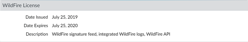 - To enable hold mode for WildFire real-time signature lookups, you must have either a WildFire or Advanced WildFire subscription service license. Make sure to activate the license on the firewall if you have not done so already. To verify subscriptions for which you have currently-active licenses, select Device Licenses and verify that the appropriate licenses display and are not expired. The example below shows the description for the standard WildFire license.