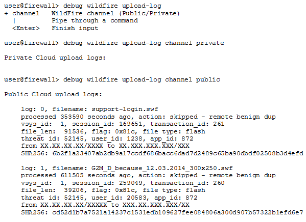 - View only samples forwarded to the Advanced WildFire public cloud with the CLI command debug wildfire upload-log channel public.
