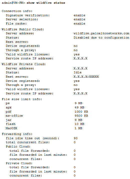 To view forwarding information for only the Advanced WildFire public cloud or WildFire private cloud, use the following commands:- show wildfire status channel public