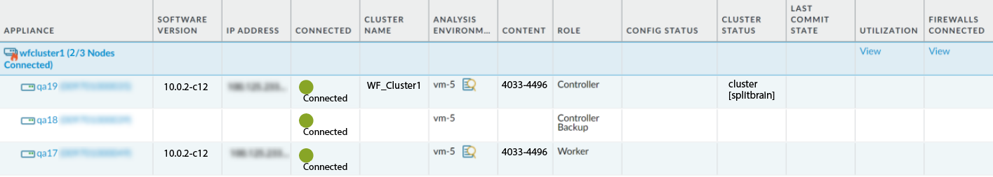 affected WildFire cluster node displays Cluster:splitbrain next