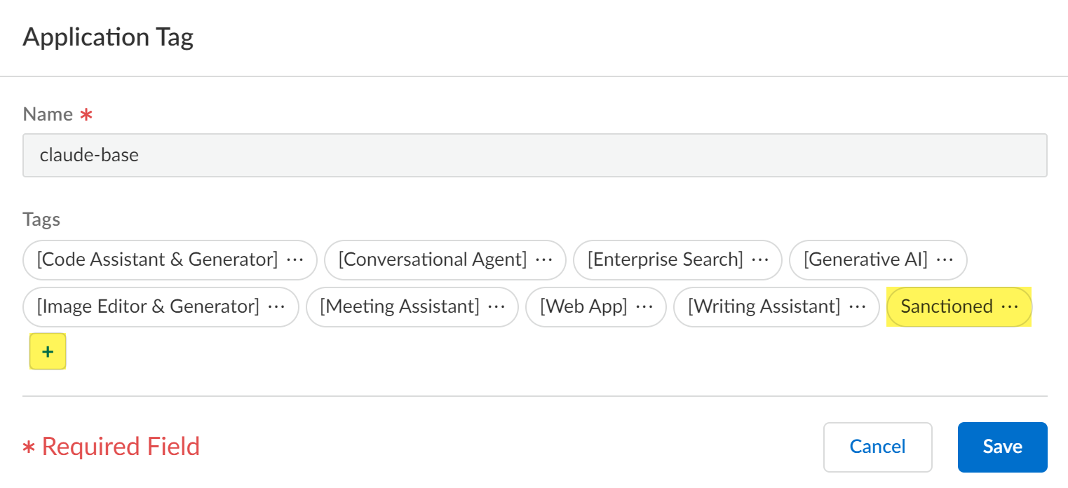 Apply tags to the application to reflect whether a GenAI app is approved within your organization from the Application config in Strata Cloud Manager.
