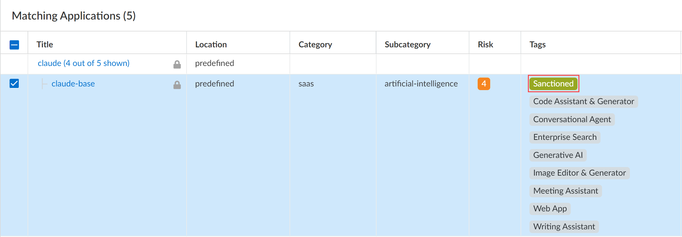 In this example, the claude-base App-ID is tagged with the Sanctioned tag.
