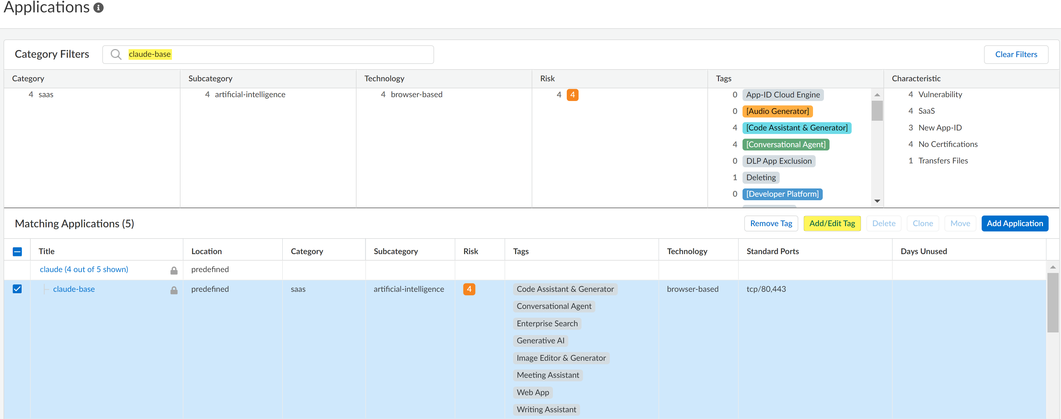 6. To review the tags that are applied to the GenAI App-ID, examine the values in the Tag column.