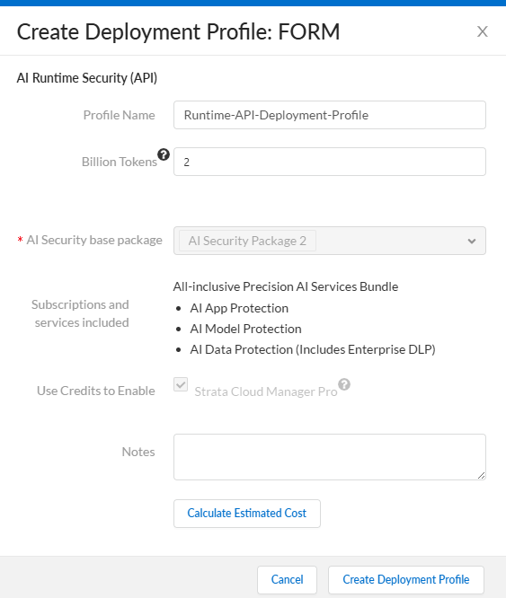 - Log in to the Customer Support Portal.Navigate to ProductsSoftware/Cloud NGFW Credits.Locate your credit pool and click Create Deployment Profile.Enter the desired Monthly Tokens (Billions). This value defines the total token capacity allocated for your Prisma AIRS API for a monthly billing cycle. New profiles are created in steps of 1 billion tokens, with a minimum value of 1 billion, and you must use integral numbers as fractional values are not supported. The deployment profile creation form in CSP displays Monthly Tokens (Billions) instead of Max API calls per day for this new model.The AI Security Package 3 and Use Credits to Enable are selected by default and cannot be changed.Click Create Deployment Profile to complete the procedure.