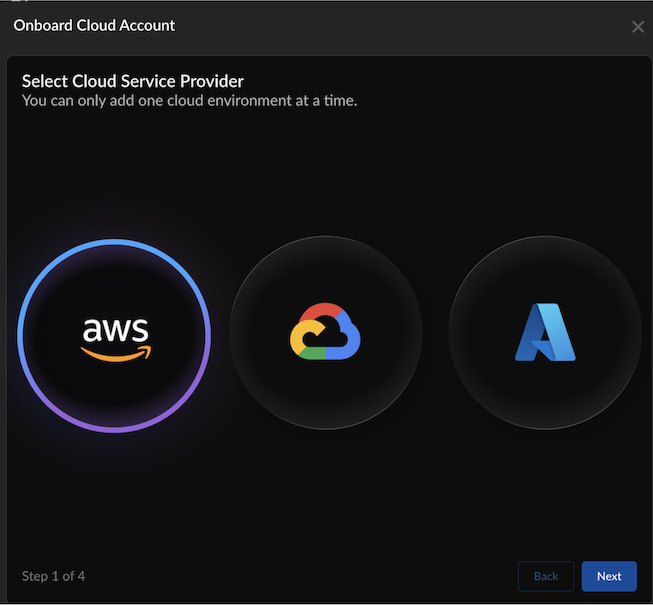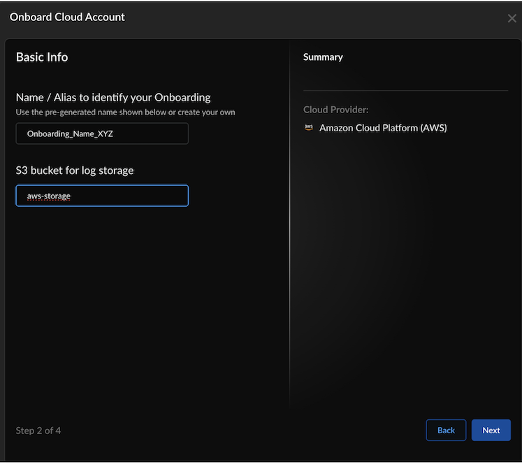 - A unique Name to identify your onboarded cloud account. (Limit the name to 32 characters).