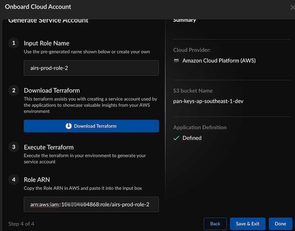 Output:#Deploy the Terraform terraform init terraform plan terraform applyApply complete! Resources: 1 added, 0 changed, 0 destroyed. Outputs: cross_account_role_arn = "arn:aws:iam::10xxxx684868:role/airs-prod-role-2"Copy the role ARN from the Terraform apply output in the previous step and paste it in the Role ARN field.Alternatively, you can also fetch the role ARN in the AWS Management Console. Navigate to IAM > Access Management > Roles, select the role name you entered in step 6 and copy the ARN from the summary page.Select Done.Add the following policy to enable Strata Cloud Manager to discover your Kubernetes clusters' assets:- Sign in to the Amazon EKS Console.Navigate to the EKS Console and click on your EKS cluster.In the Access tab, select the IAM access entries section. Click the Create access entry button.Find the IAM principal ARN role that was created as part of the onboarding process when you executed the onboarding Terraform.Add AmazonEKSAdminViewPolicy under Policy name.Click Create and finish the creation process.You can now view and manage the onboarded cloud accounts in Strata Cloud Manager.To discover your protected and unprotected cloud assets, see the page on discovering your cloud resources.This validates the successful creation of a service account in AWS.Initial data should populate on Strata Cloud Manager in about 30 minutes and the flow logs may have a delay of about an hour to show up on the Strata Cloud Manager dashboard.Next, protect the network traffic flow by deploying Prisma AIRS AI Runtime firewall or VM-Series firewall in AWS.