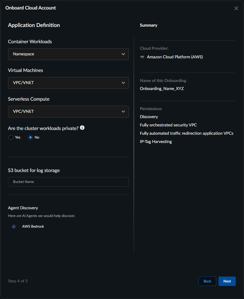 In Application Definition, configure how your assets will be grouped for discovery.- Your selected application boundaries determine which applications appear in the deployment workflow. For all workload types, Prisma AIRS AI Runtime firewall maps applications to their VPCs, and the firewall protects traffic at the VPC level. The namespace shows applications from Pods/Cluster workloads, while VPC/VNETs display applications from virtual machine workloads.