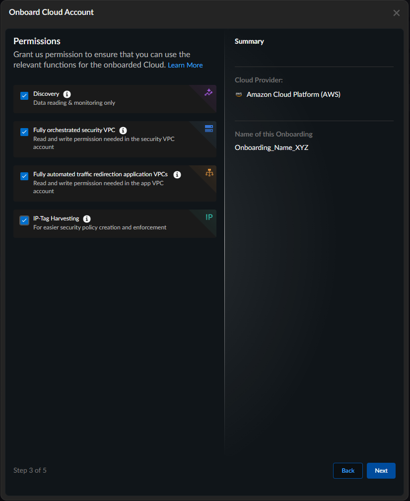 Specify the permissions to apply to this AWS account. For a list of the specific permissions enabled, see AWS Required Permissions.- Discovery—this option is pre-selected and cannot be disabled. This allows Prisma AIRS to identify and monitor assets in your AWS environment.