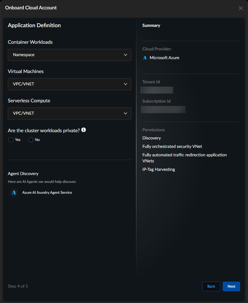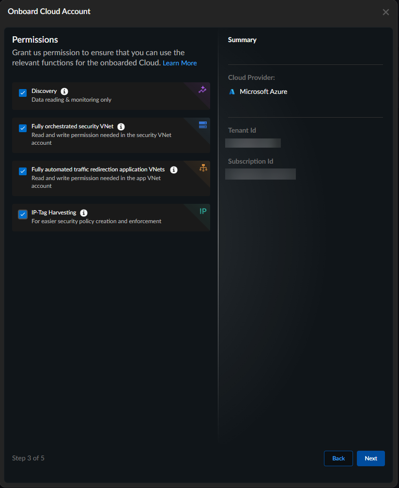 Click Next.Specify the permissions to apply to this Azure account. For a list of the specific permissions enabled, see Azure Required Permissions.- Discovery—this option is pre-selected and cannot be disabled. This allows Prisma AIRS to identify and monitor assets in your Azure environment.