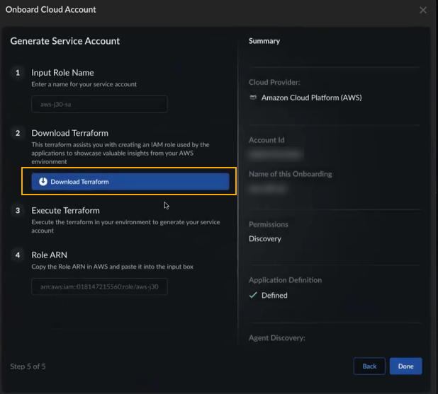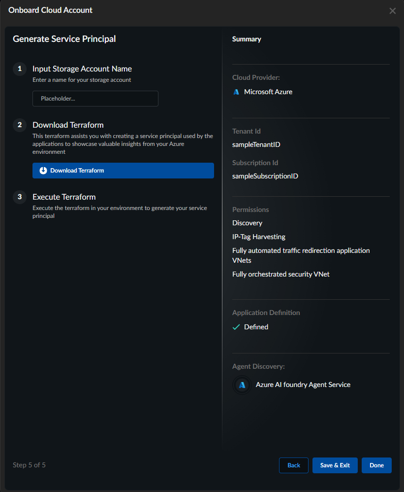 This section describes how to download an onboarding Terraform template when using AI Agent Discovery. When you apply this template in your cloud environment, it generates a service account with sufficient permissions. These permissions enable AI Agent Discovery within your cloud environment, granting access to network flow logs, asset inventory details, and other essential cloud resources.When you onboard an Azure cloud account, consider the following:- For new accounts, you'll need to onboard a cloud account if one is not present in the tenant.