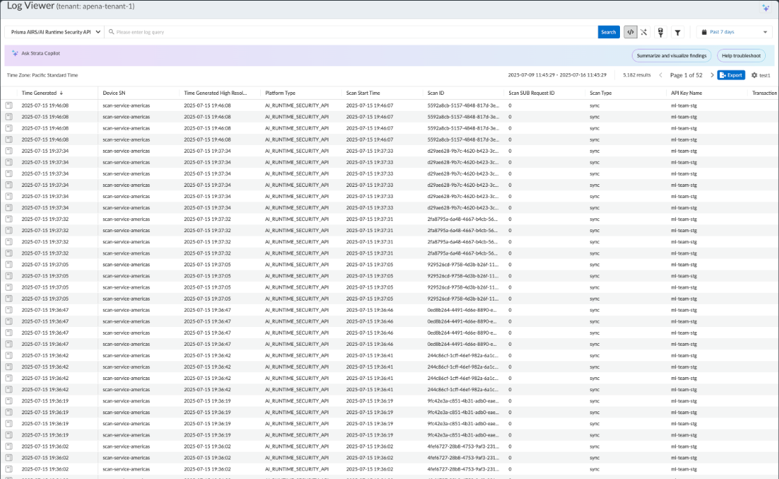 Example client configuration code:{ "servers": { "prisma-airs": { "type": "http", "url": "https://service.api.aisecurity.paloaltonetworks.com/mcp", "headers": {"x-pan-token": "your-api-key", "x-pan-profile": "your-profile(optional)"} } } }The Palo Alto Networks MCP server tool descriptions don’t guarantee that your agent's LLM will invoke the server. AI agents and applications are responsible for building specific integration points to invoke Palo Alto Networks MCP tools. These integration points include system prompts, MS copilot connectors, and MS copilot topics.Monitor the MCP server logs. In the log viewer, review the MCP attributes Sub Type(PANW MCP Server) and Scan Type (sync: pan_inline_tool, async: pan_batch_tool) for troubleshooting any issues.