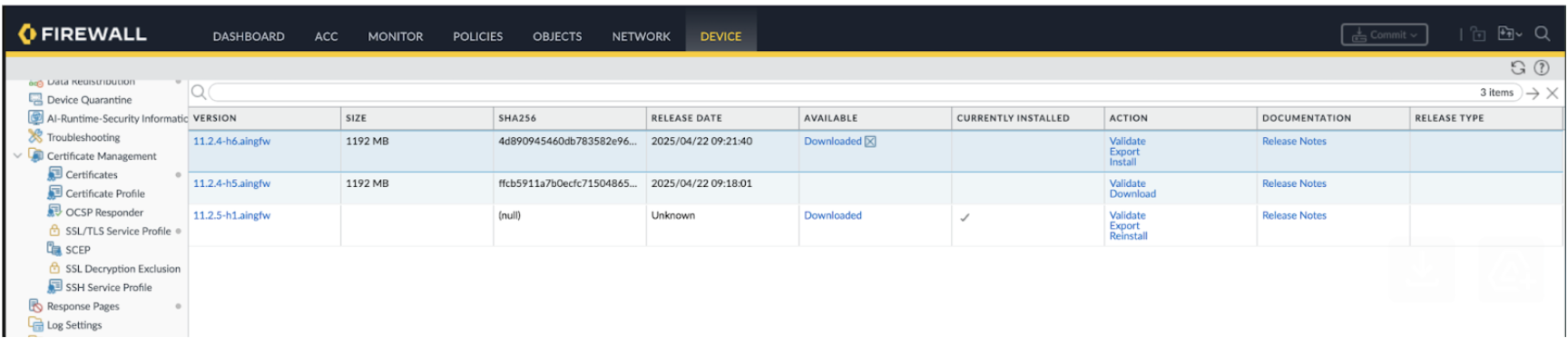 - Locally download and install the Prisma AIRS AI Runtime: Network intercept image with *.aingfw extension.When the image is successfully downloaded, the Panorama web interface shows the filename version with *.aingfw extension and platform as "AI Runtime Security".There is a known issue (PAN-288025) wherein Panorama can’t centrally manage the Prisma AIRS AI Runtime: Network intercept image.You can download (Panorama > Device Deployment > Software and Check Now) a Panorama managed Prisma AIRS AI Runtime: Network intercept from the Customer Support portal with the *.aingfw extension; however, you can't manage it through Panorama. This is because, the device group and template don’t connect when installing the image.Workaround: Download the image and manually deploy it on the firewall directly with the web interface or PAN-OS CLI commands.