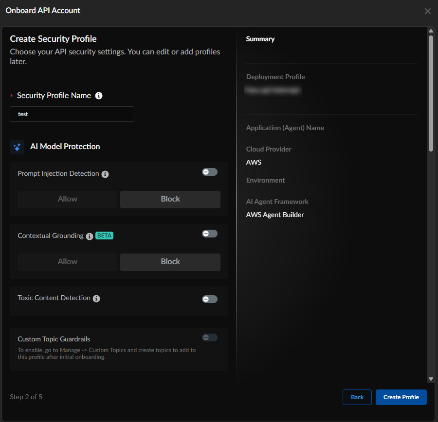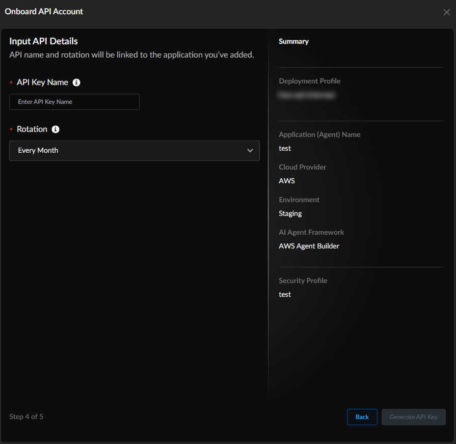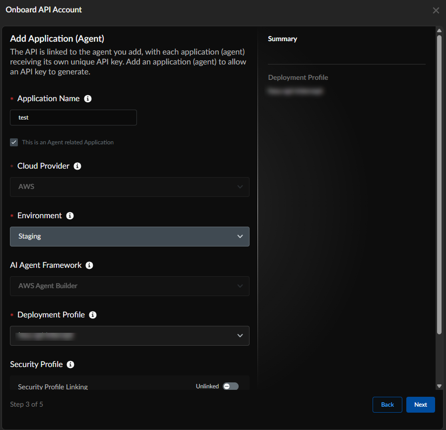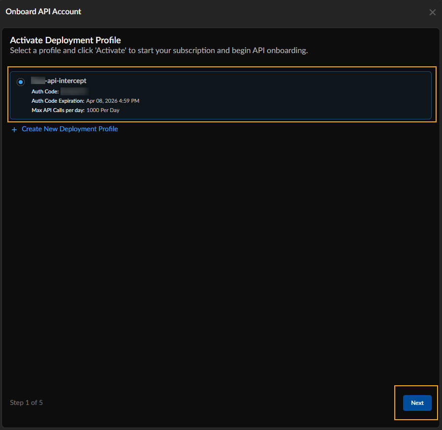 When you click + to activate a deployment profile, existing profiles appear; if you select a profile you can go through the process of creating a new security profile. You can use an unexpired API key for a cloud provider to protect the agent belonging to the provider.In the Onboard API Account page, select the radio button next to the profile, then click Next:
