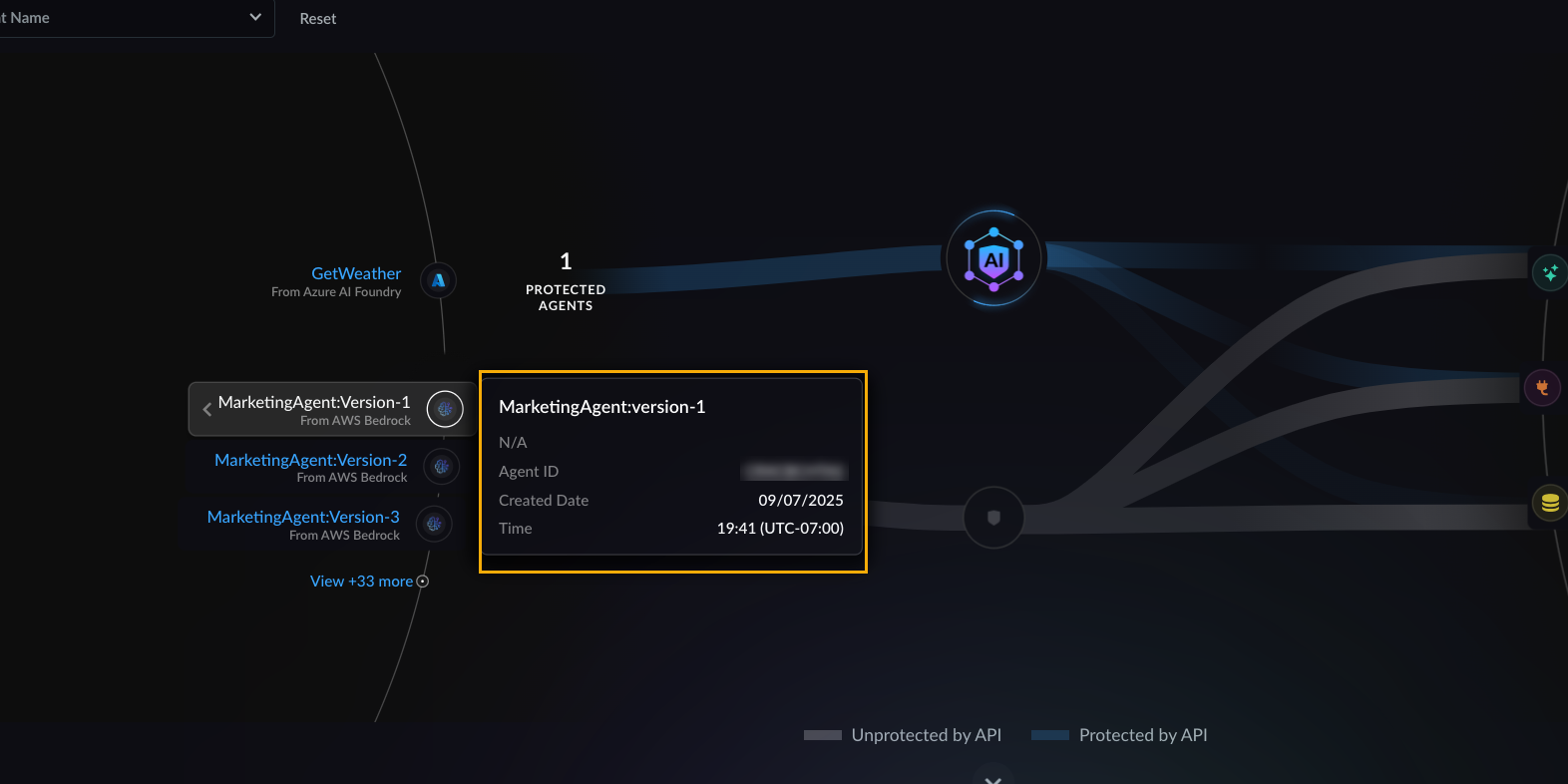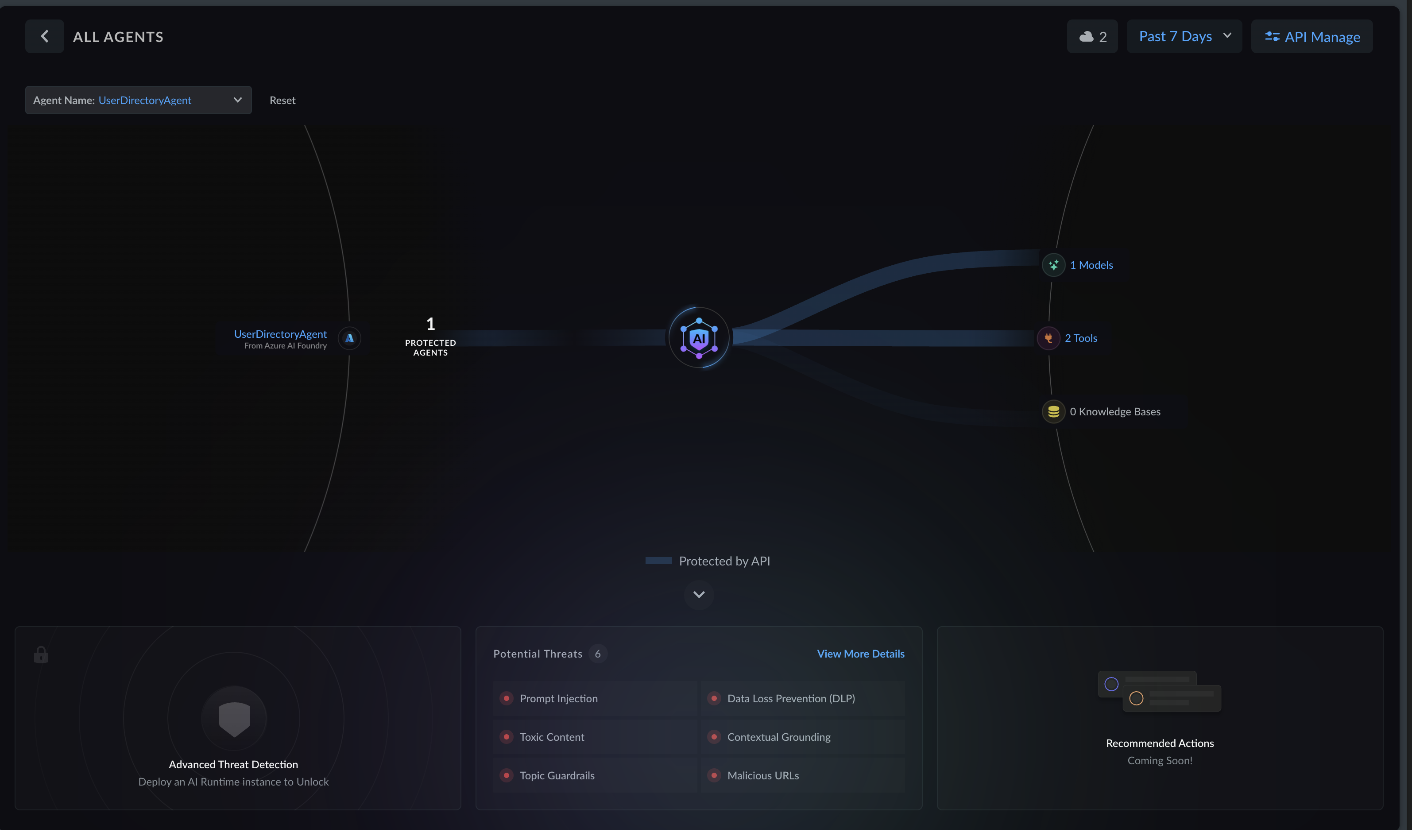 When an AI agent exists in the protected state it is displayed in the All Agents dashboard. This view illustrates the protected threats and associated models, tools and knowledge bases: