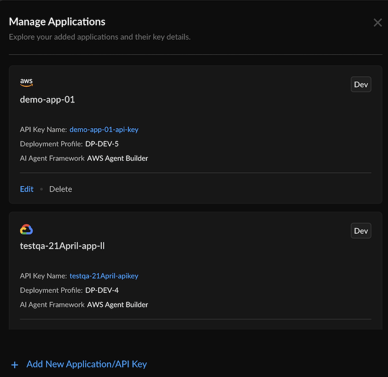 Edit: If you want to update the application name, cloud provider, environment, and the AI agent framework.Delete: This deletes the application and the API key associated with it.Select Add new application/API key to initiate the onboarding workflow for creating an application and API key. This workflow uses an unused deployment profile associated with the tenant.Manage API Keys