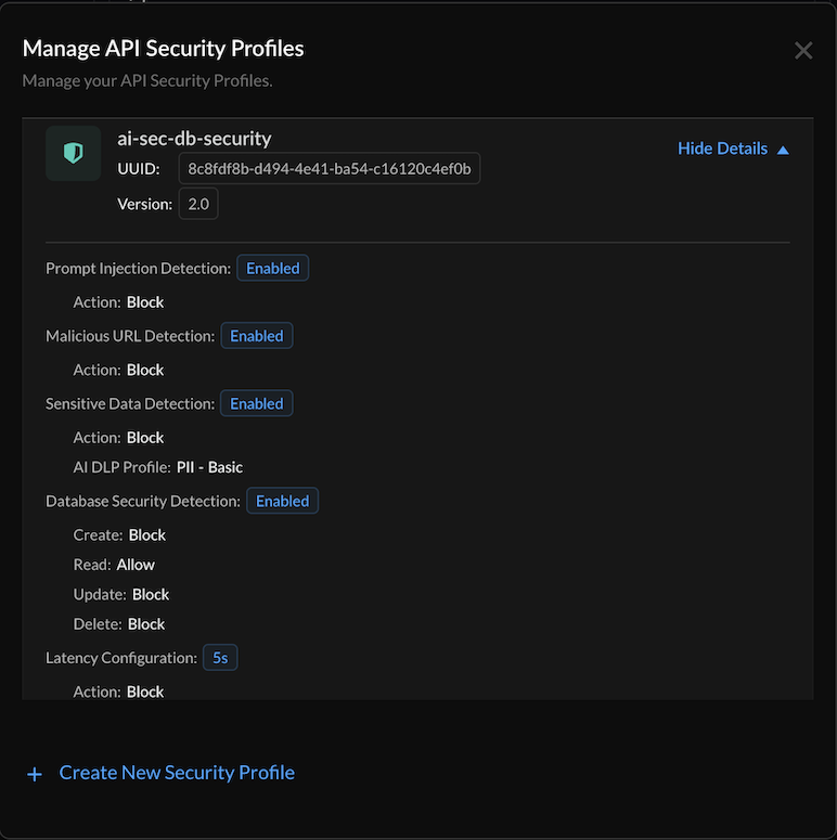 Edit: Update your security profile configurations:- You can update the security profile name, AI model protection, AI application protection, AI data protection, and Latency configuration.