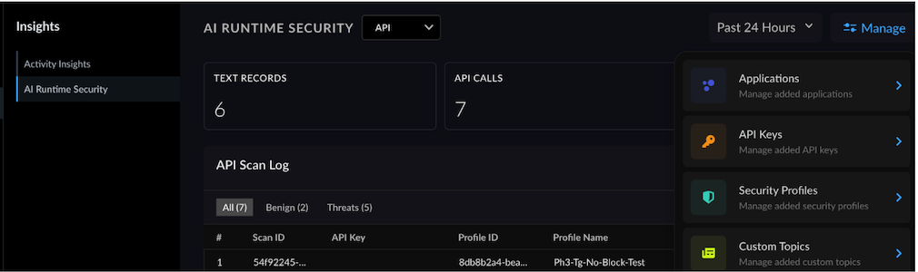 - Log in to Strata Cloud Manager.Navigate to AI Security API Applications.Select Manage from the top right corner.Select one of the applications, API keys, security profiles, or custom topics, and follow the respective section.