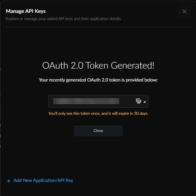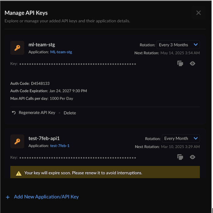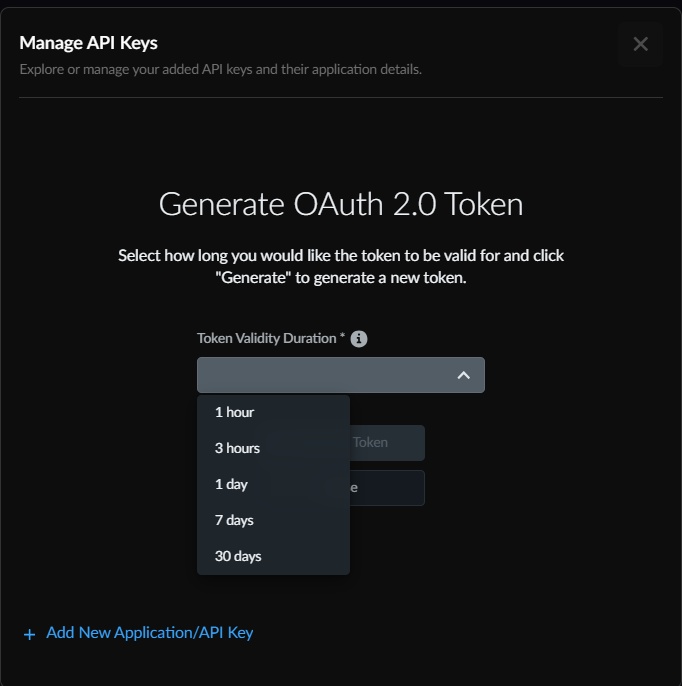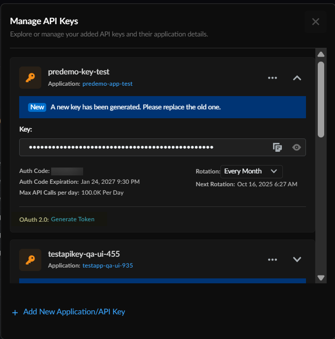 Regenerate API key token. This revokes the existing API key and creates a new one.Delete: This deletes the API key and its associated application.Set the API key Rotation time interval by selecting the drop-down (Every month, 3 months, or 6 months).The rotation takes effect only when you regenerate or create a new API key.Select Add new application/API key to initiate the onboarding workflow for creating an application and API key. This workflow uses an unused deployment profile associated with the tenant.Generate OAuth 2.0 token