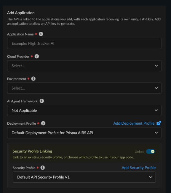 Security Profile Linking: The Security Profile Linking (when enabled while adding an AI application) automatically associates the default Security Profile with the AI profile. Toggle Linked to enable Security Profile Linking to link to an existing Security Profile automatically (based on the AI application the Security Profile is linked with).