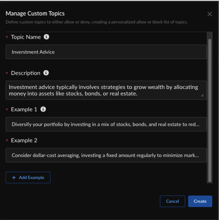 Create or update custom topics for custom topic guardrails threat detections and eanble this detection service in the API security profile. - Select Manage Custom Topics.Add New Custom Topic.Enter a custom Topic Name. Limit the name to 100 characters.Enter a Description explaining the purpose of this custom topic. Limit it to 250 characters.Enter relevant Examples for your custom topic. Limit them to 250 characters.Create or Update.