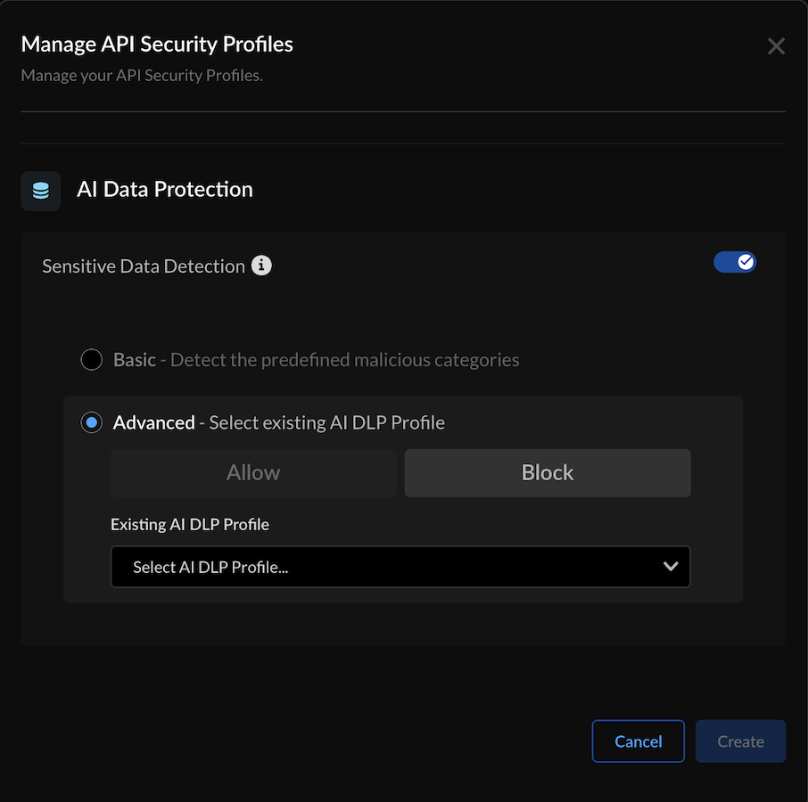 - Log in to Strata Cloud Manager.Navigate to AI Security > AI Runtime Firewall.Select Manage from the top right corner, then select Security Profiles.Select Create Security profile.To edit an existing profile, enter the Security Profile Name.Select the following protections and set the appropriate action (block or allow):