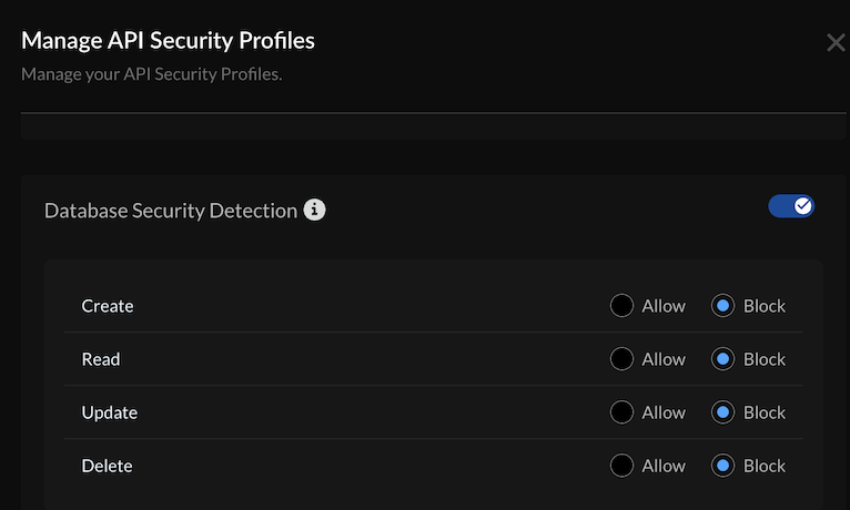 Enable Database Security Detection for AI Data Protection; this detection is for AI applications that use genAI to generate database queries and regulate the types of queries generated. Set an Allow or Block action on the database queries (Create, Read, Update and Delete) to prevent unauthorized actions: