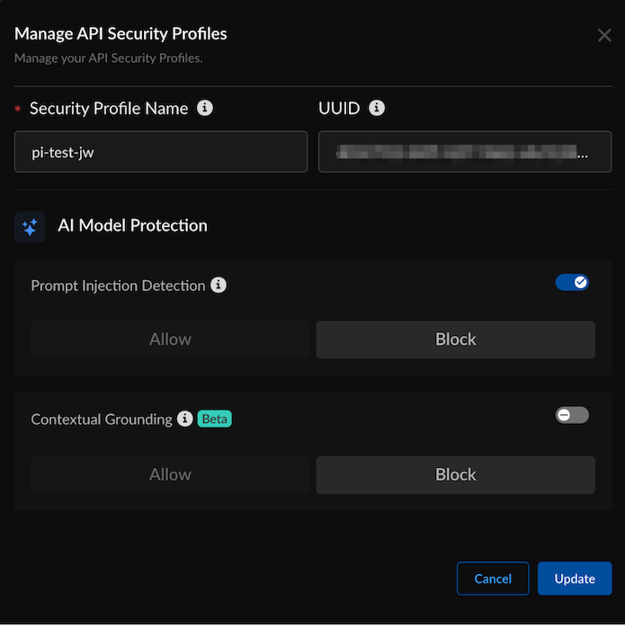 After enabling the Protection Type, click Update.After updating the security profile the Manage API Security Profiles screen refreshes to display the configuration changes.Example MCP Threat Detection Use Case