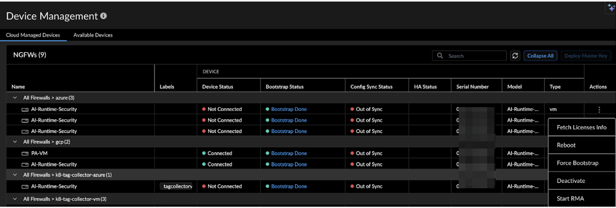 16. Switch to the Cloud Managed Devices tab to view and manage the connected state, the configuration sync state, and the deployed Prisma AIRS licenses.