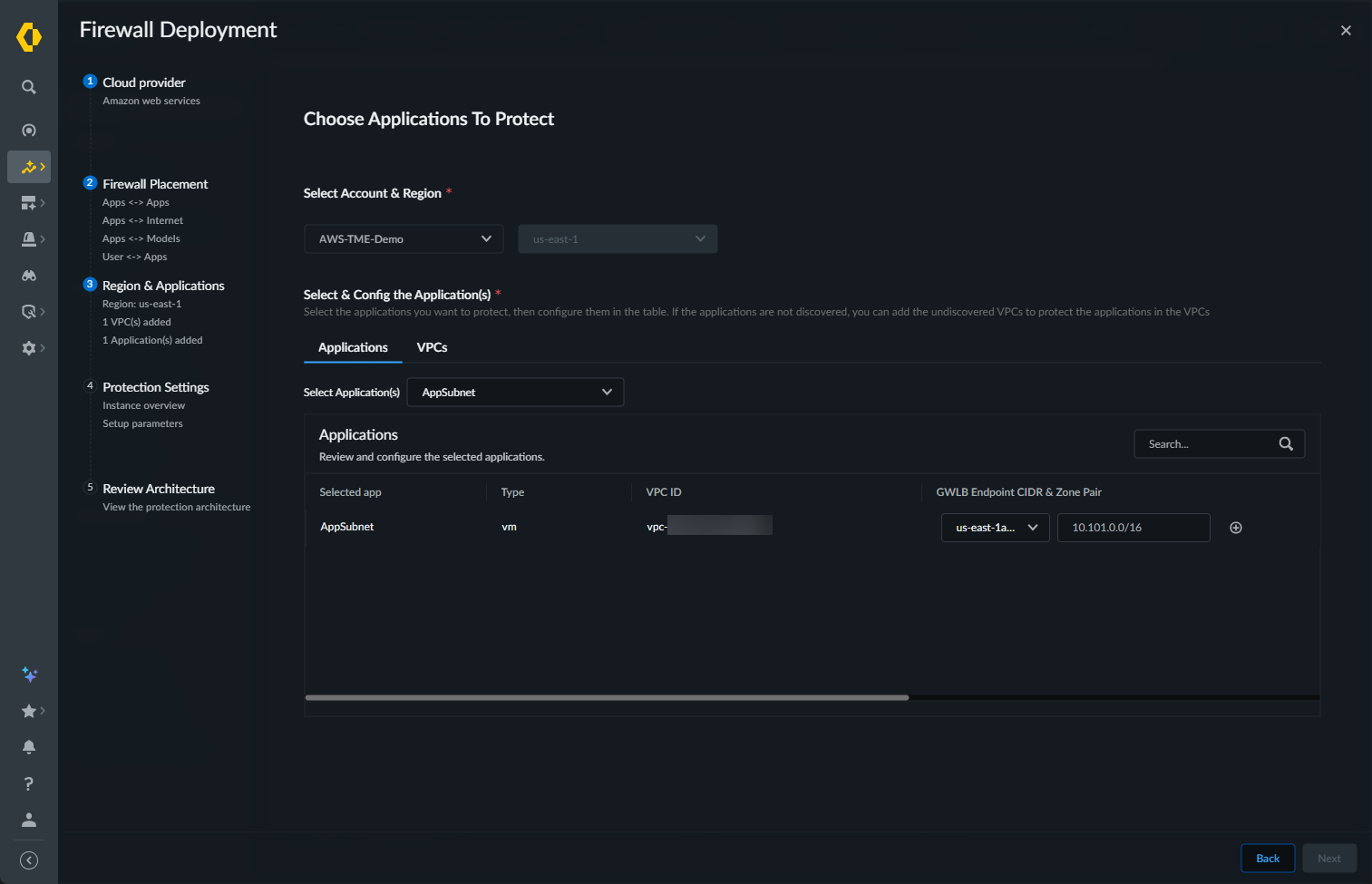 - On the Applications tab, use the Select Application(s) drop-down to specify the discovered applications to secure. The selected application appears in the Applications list.The available applications are determined by the application definition criteria you configured during cloud account onboarding in the “Application Definition” step.Set the gateway load balancer (GWLB) endpoint CIDR and zone. Click theicon to add the second zone and GWLB endpoint CIDR.