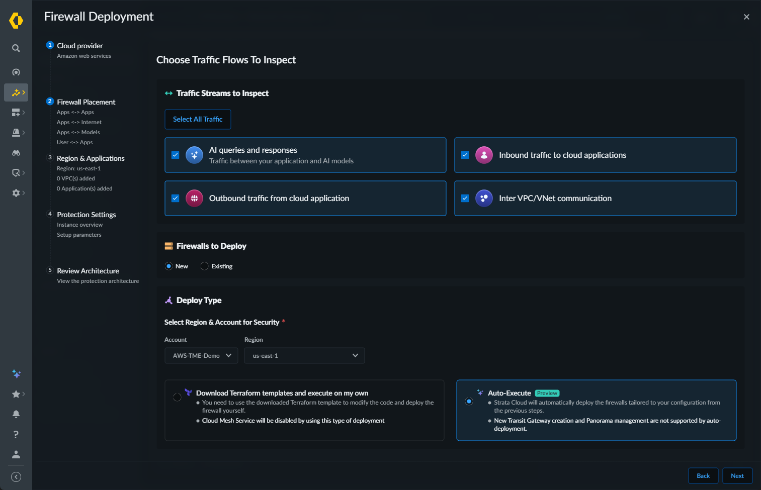 - On the Applications tab, use the Select Application(s) drop-down to specify the discovered applications to secure. The selected application appears in the Applications list.The available applications are determined by the application definition criteria you configured during cloud account onboarding in the “Application Definition” step.Click Next.Configure the Deployment Parameters. The Auto-Execute deployment option supports AI Runtime Security; not VM-Series. The Firewall Type option is pre-selected based on the traffic types you previously selected on the Choose Traffic Flows to Inspect screen. If you select AI queries and responses, the Firewall Type is pre-selected and cannot be changed.
