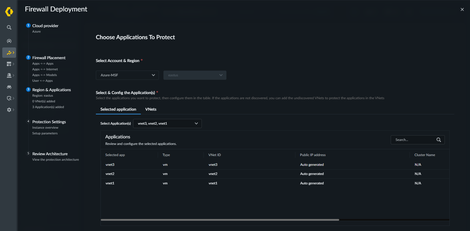 Choose Applications to Protect. Specify which discovered applications you want to secure with this firewall cluster.