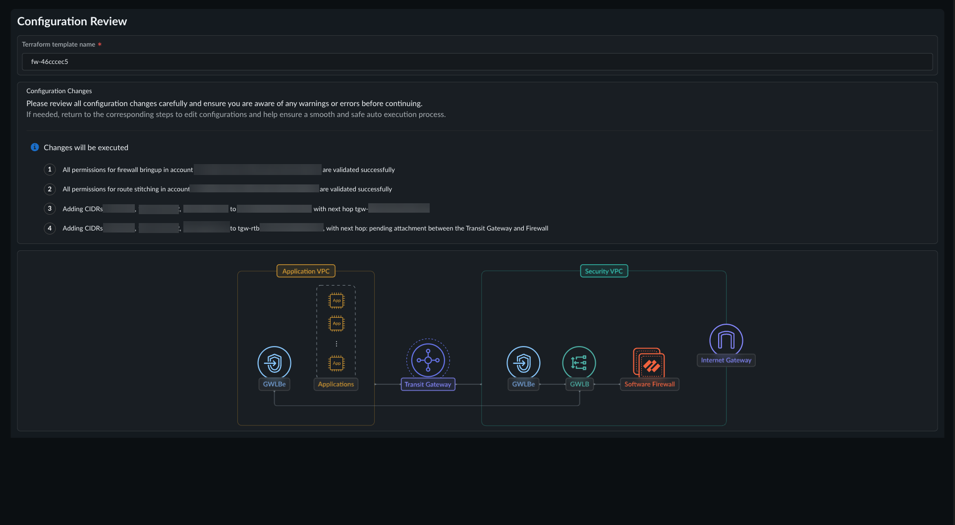- Enter the CIDR IP address of an unused VPC. (Go to AWS Management Console > VPC, select your VPC, and get the CIDR for your VPC).Enter your TGW information. When using the Auto-Execute deployment option, you must select an existing TGW; you cannot create one as part of your firewall deployment.