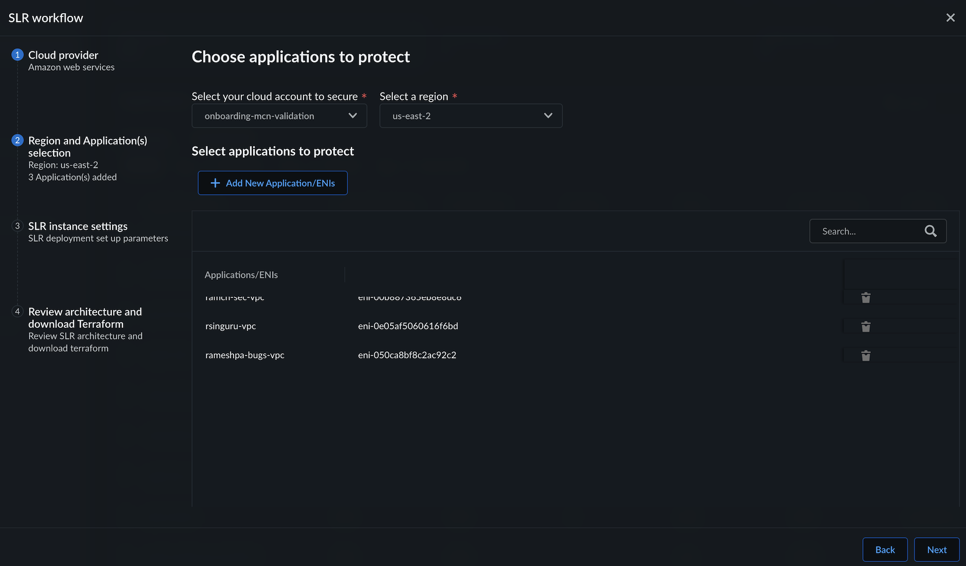 In Regions & Application(s):- Select your cloud account to secure from the onboarded cloud accounts list.Select a region in which you want to protect the applications.Click Add New Application/ENIs, and select the application ENIs from the available list.Select Next.